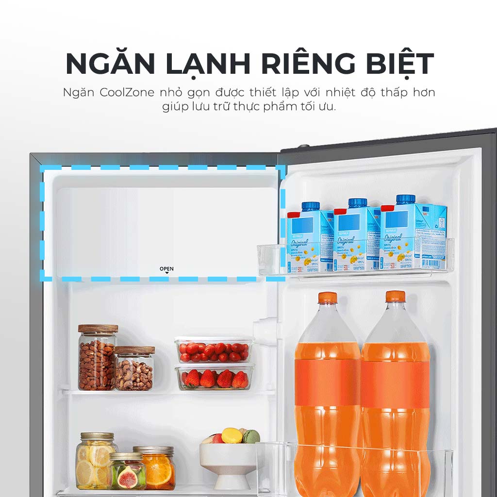 Cánh cửa tủ cũng được thiết kế thông minh với các kệ đựng chai lọ có kích thước khác nhau, cho phép bạn đặt từ chai nhỏ đến chai lớn, lon nước giải khát, sữa hộp một cách gọn gàng. Nhờ đó, dù dung tích chỉ 94 lít nhưng không gian bên trong được tối ưu hóa tối đa, đáp ứng nhu cầu lưu trữ thực phẩm hàng ngày.