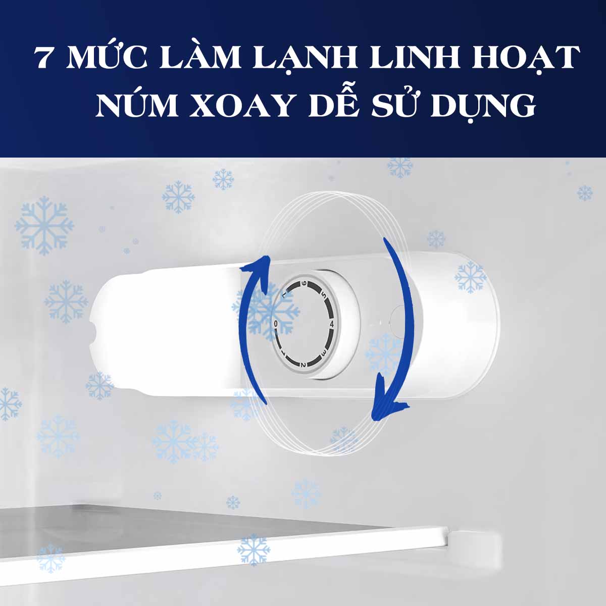 Núm vặn cho phép tùy chỉnh nhiều mức nhiệt độ khác nhau, từ mức thấp đến cao, giúp người dùng linh hoạt hơn trong việc bảo quản đa dạng các loại thực phẩm. Ví dụ: có thể điều chỉnh nhiệt độ thấp để giữ rau củ tươi lâu hơn, hoặc tăng nhiệt độ khi chỉ cần làm mát nhẹ cho nước uống, trái cây hoặc bánh ngọt.