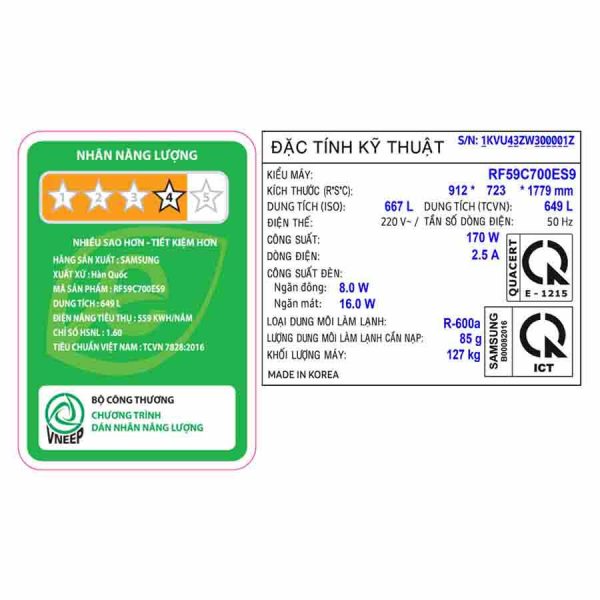 - Công suất tiêu thụ công bố theo TCVN: ~ 1.53 kW/ngày