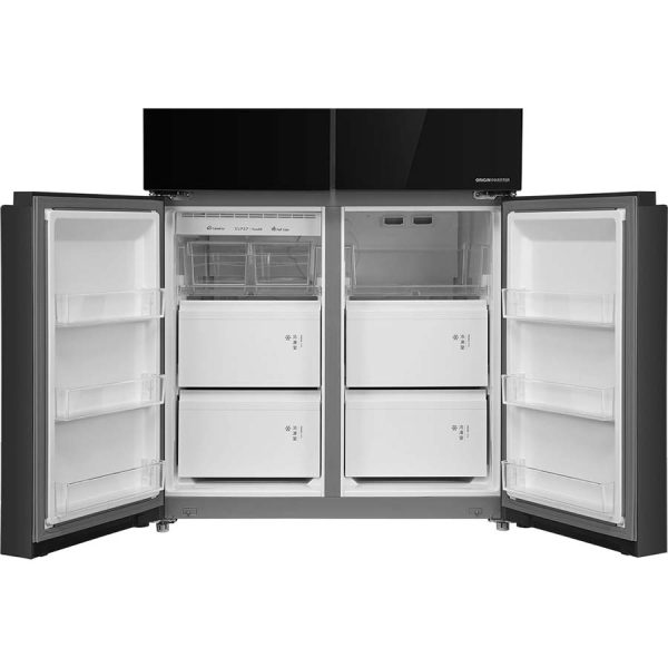 Tủ được thiết kế theo dạng Multi Door (đa cửa) với bố cục hợp lý và khoa học. Thiết kế này không chỉ tạo điểm nhấn thị giác mà còn tối ưu hóa không gian bảo quản. Các ngăn kéo được bố trí linh hoạt giúp người dùng dễ dàng sắp xếp và phân loại thực phẩm theo từng nhóm riêng biệt như rau củ, thịt cá, thực phẩm chín sống hay đồ đông lạnh. Nhờ đó, việc lấy và cất thực phẩm trở nên nhanh chóng, tiện lợi và hạn chế lẫn mùi hiệu quả.